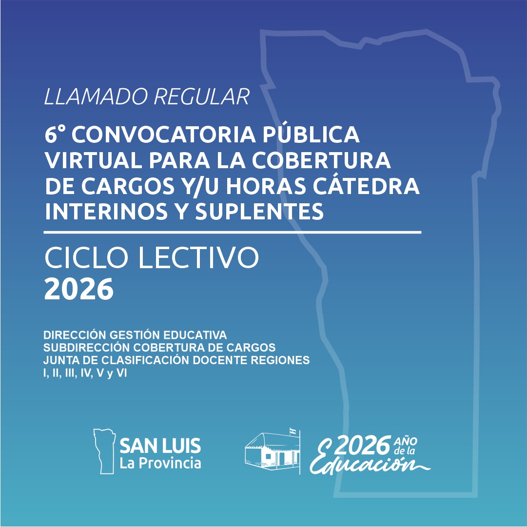 Fecha y hora límite: las manifestaciones de voluntad para la cobertura de cargos y/u horas cátedra se recepcionarán a través del Sistema de Junta de Clasificación Docente de la provincia de San Luis (https://jcdocente.sanluis.edu.ar) el día martes 28 de abril de 2026, desde las 08:00 hasta las 14:00.