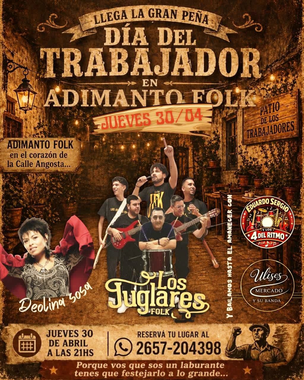 En el contexto del del Día del Trabajador, la ciudad de Villa Mercedes vivirá una noche cargada de identidad, música y encuentro popular con una Gran Peña en Adimanto Folk, en plena Calle Angosta. La propuesta reúne a destacados artistas que representan lo mejor del folclore y la música popular en una grilla pensada para celebrar a los trabajadores con una verdadera fiesta criolla.