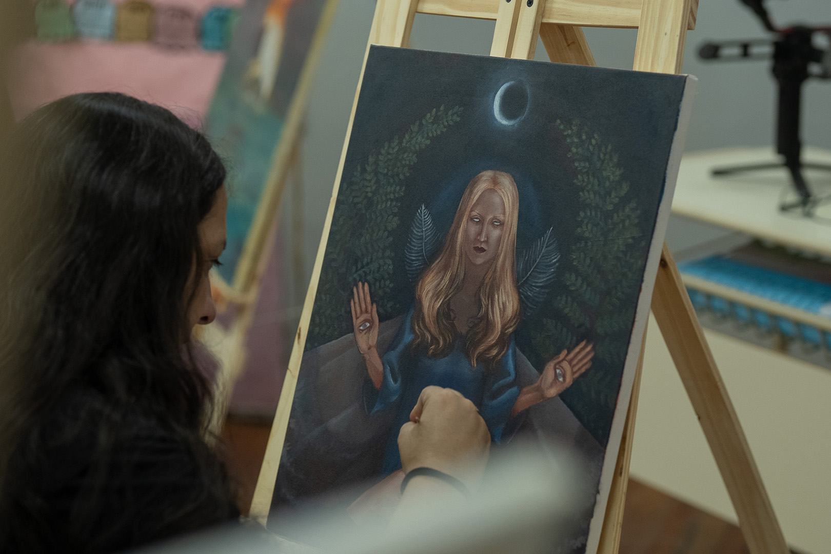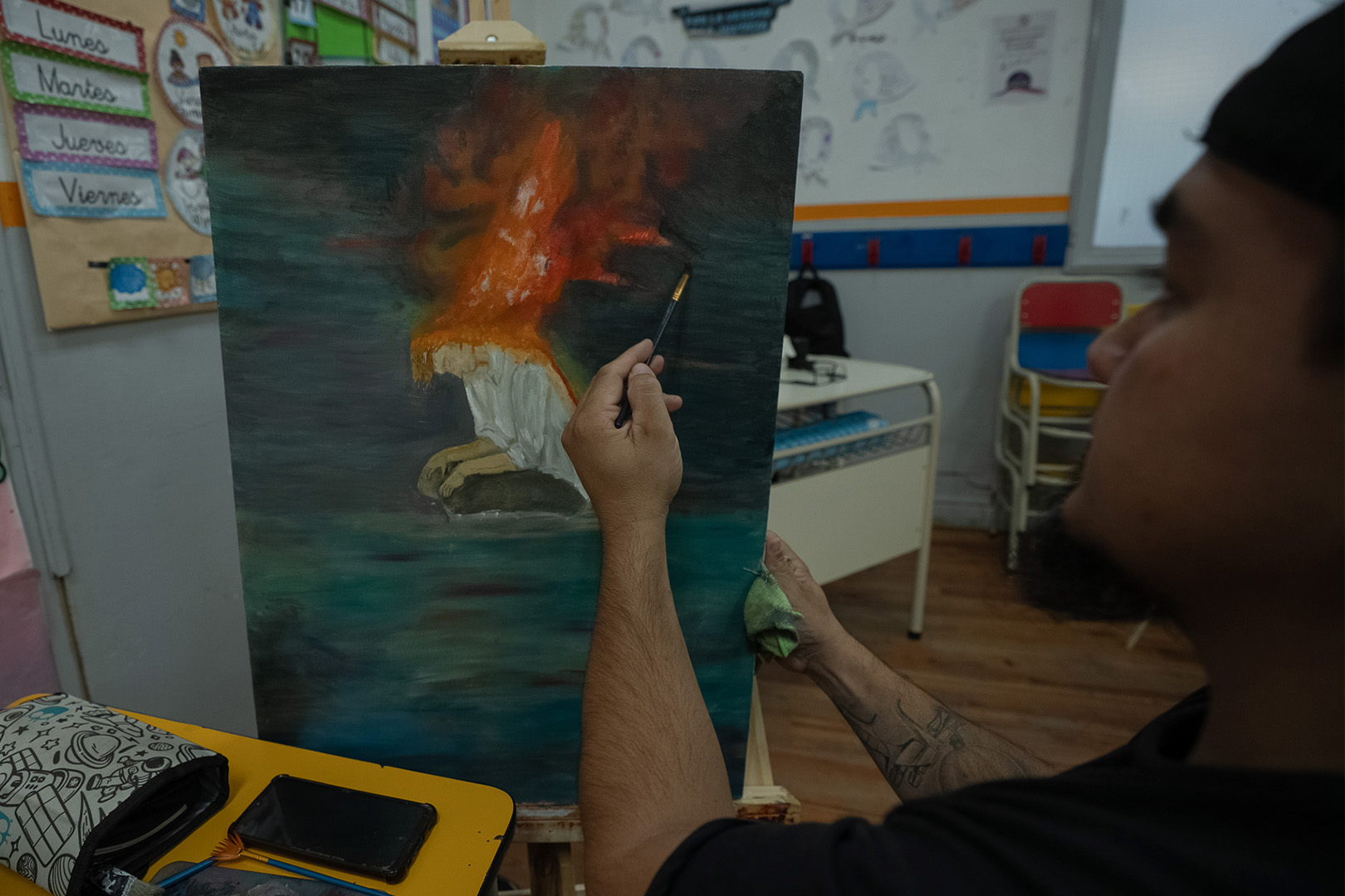 El grupo de los miércoles está integrado por estudiantes más avanzados, que comenzaron el año pasado y que actualmente trabajan con técnicas como óleo y acrílico. En esta etapa, el foco está puesto en proyectos más personales. Cada participante llega con una idea propia que plasma en el lienzo a partir de distintas herramientas y recursos.