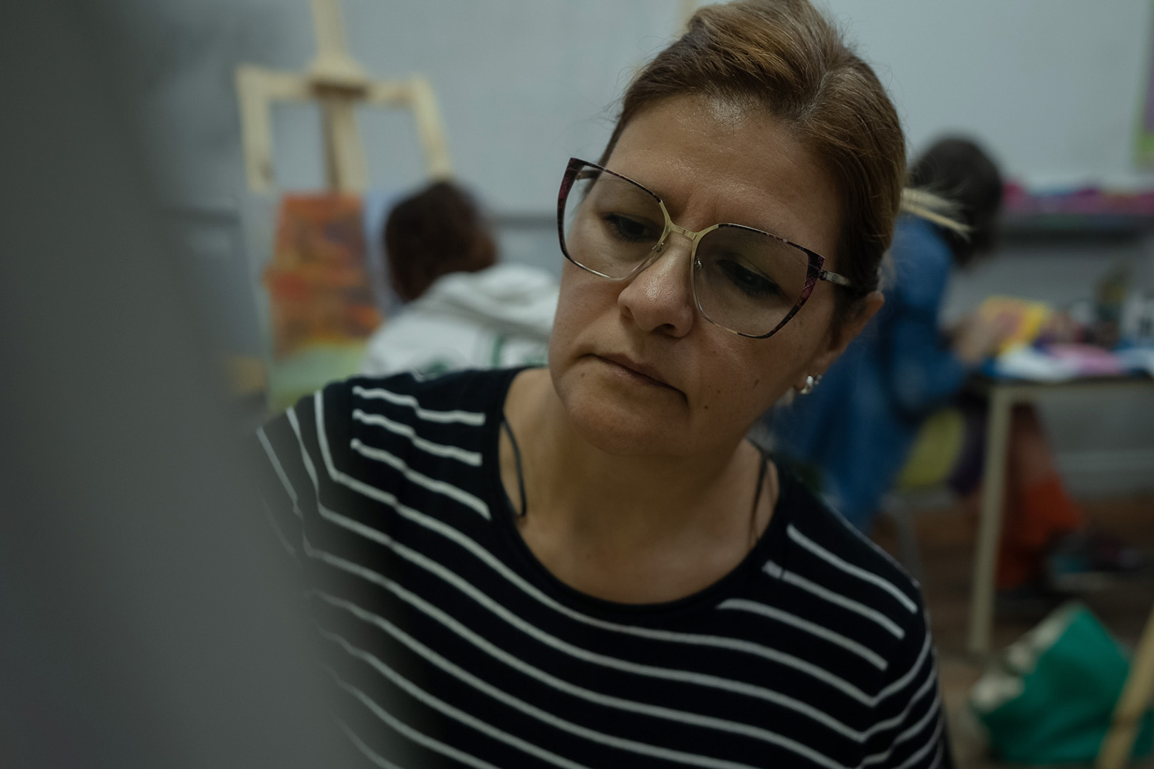 Por otro lado, quienes asisten los lunes y viernes transitan una instancia más introductoria. Allí se inician en aspectos fundamentales como el armado de bastidores, el conocimiento de materiales y las bases de la composición. Se trata de un primer acercamiento que sienta las bases para avanzar hacia la pintura propiamente dicha.