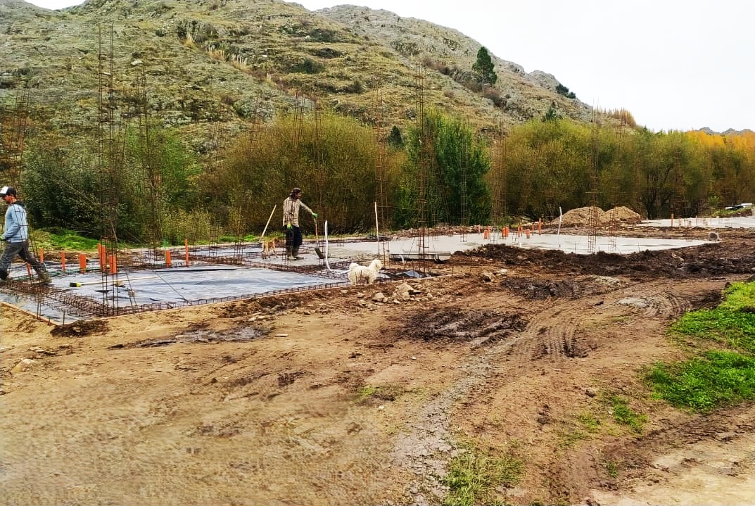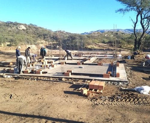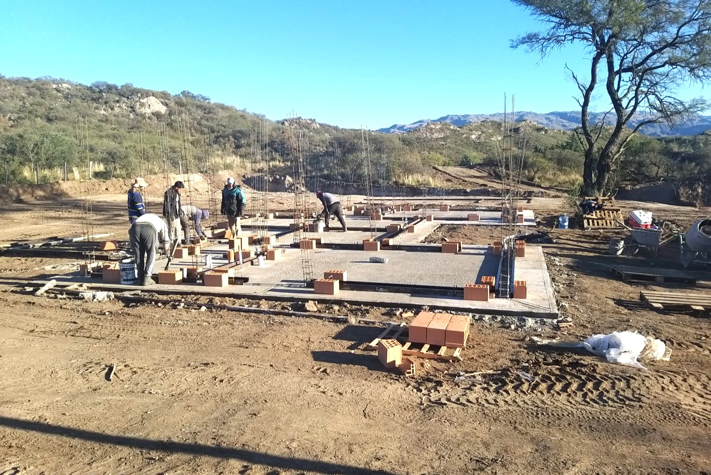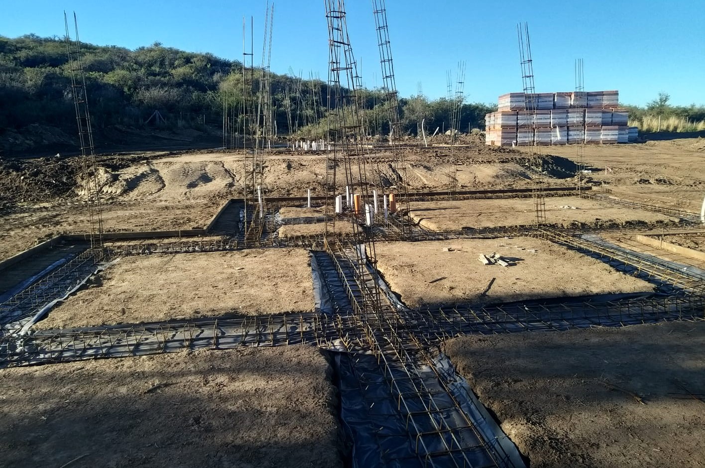 En La Carolina, en tanto, se construyen seis viviendas. Allí, la obra se centra en la consolidación de las fundaciones y el inicio de la estructura base. Se destacan plateas ya hormigonadas y la disposición de armaduras verticales para columnas, lo que indica que esta etapa se encuentra próxima a su finalización y permitirá avanzar con el levantamiento de muros.