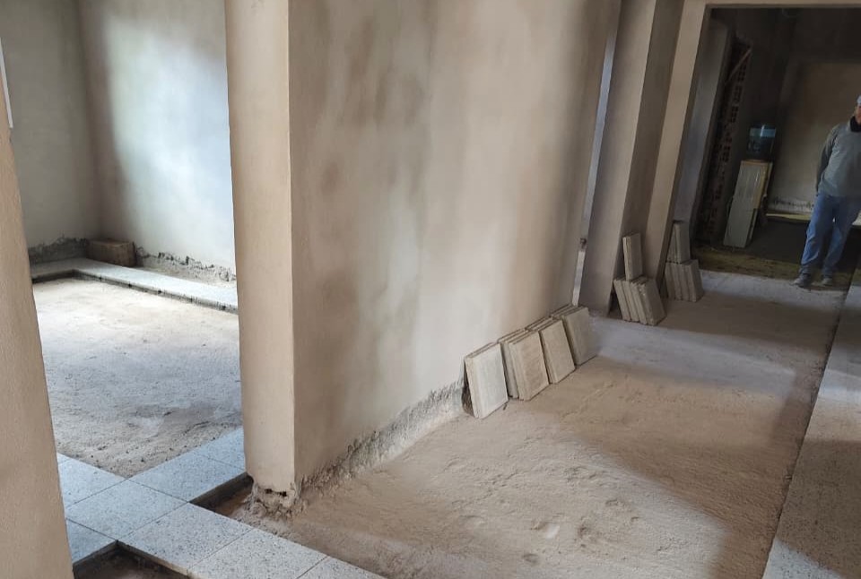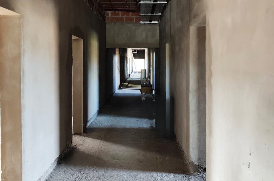 Los trabajos se concentran en la finalización de revoques finos interiores, colocación de pisos y avances en instalaciones eléctricas, señales y aberturas.